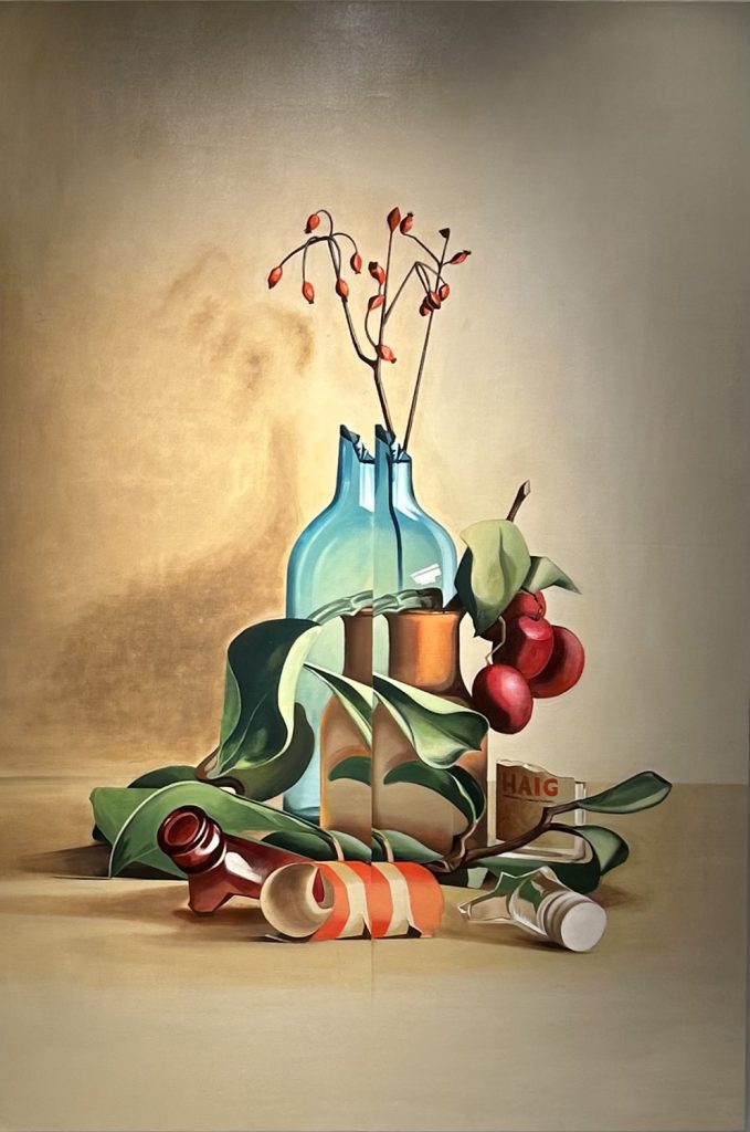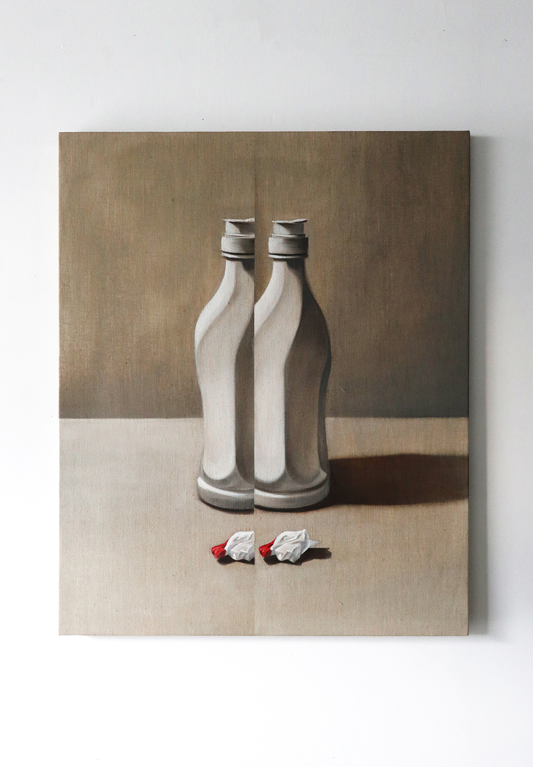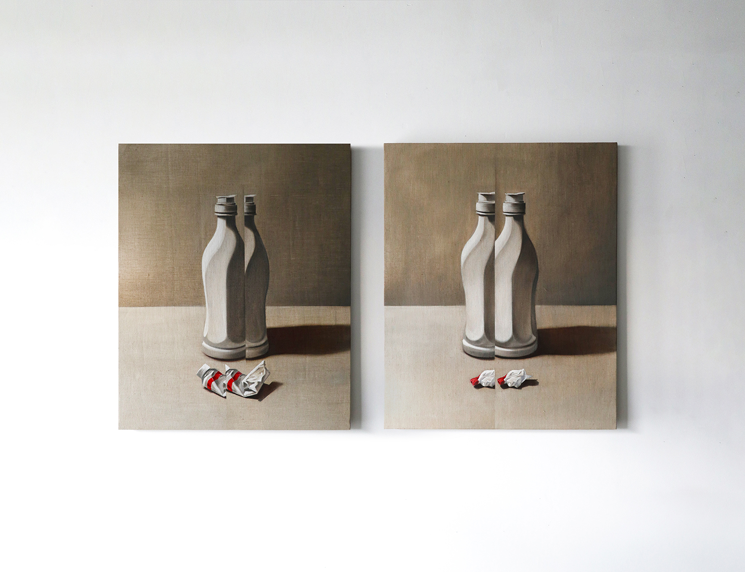 静物シリーズの起点となったのは、父親の遺骨を描いた一枚であった。死別をきっかけに衝動的に描かれたその作品は、後にシリーズへと展開していくが、振り返ると、選ばれてきたモチーフの多くが「本来の役目を終えたもの」であったことに気づく。漂流ゴミのプラスチックボトル、血痕の残るティッシュ、使い切られた絵の具のチューブ、成長とともに履けなくなった娘の靴や玩具、瓶や欠片、古道具、骨…それらは一見すると不要なものとして分類される存在でありながら、作家の視点を通すことで、機能と非機能、生と死、記憶と忘却の境界を揺さぶる強い存在感を帯びて現れる。