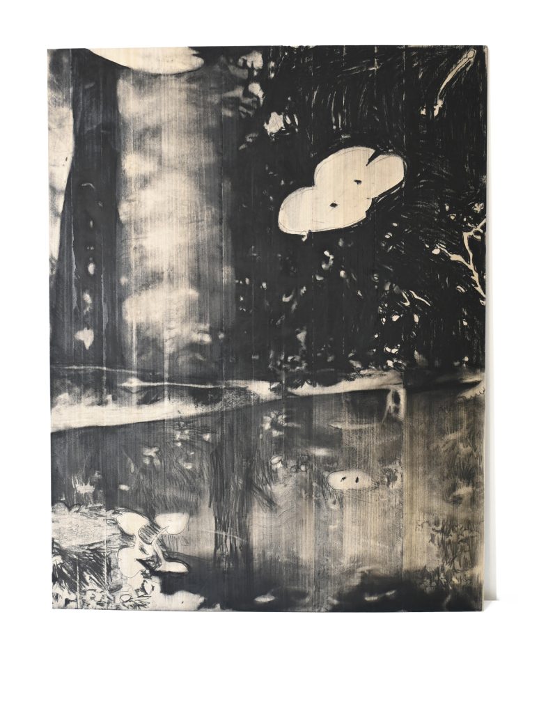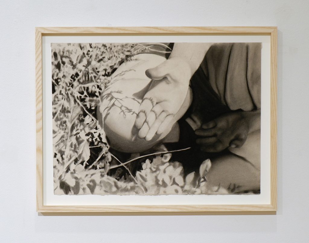 描く行為は、思考であり、空間であり、世界の中で“在る”ことそのものです。木炭の黒に身をゆだねながら、自身の感情の揺らぎを画面に刻み続けています。
