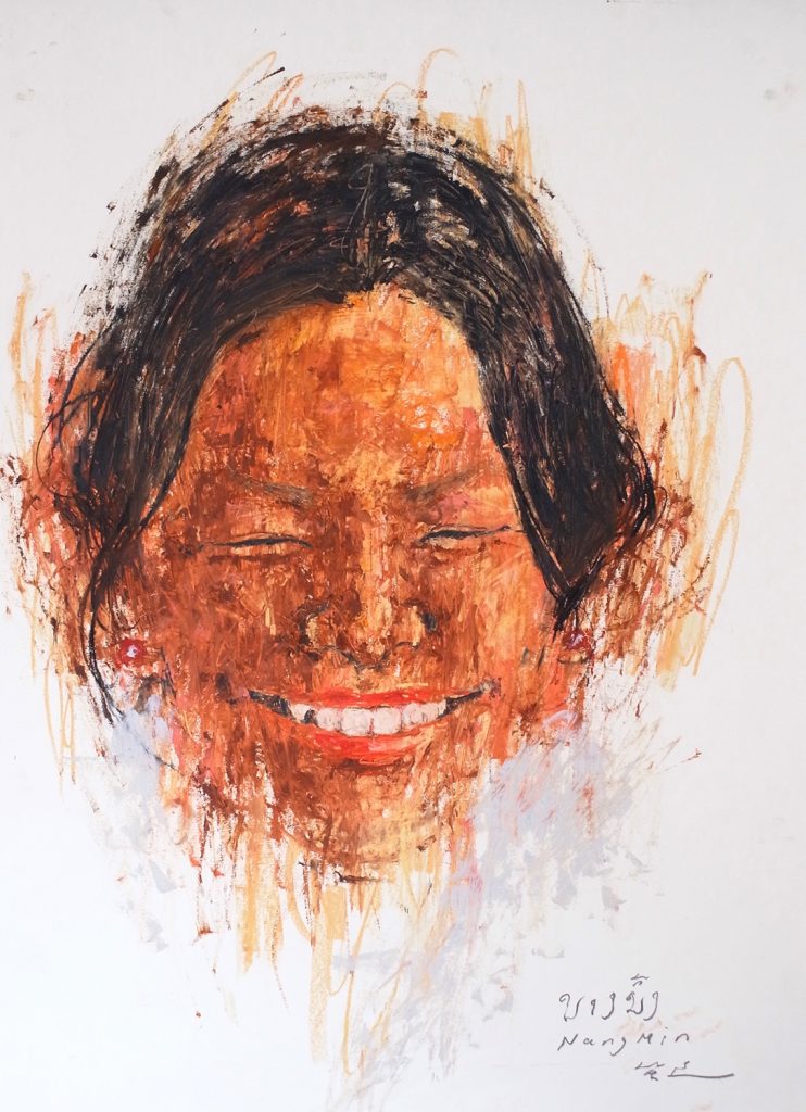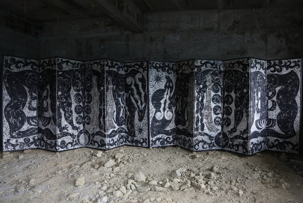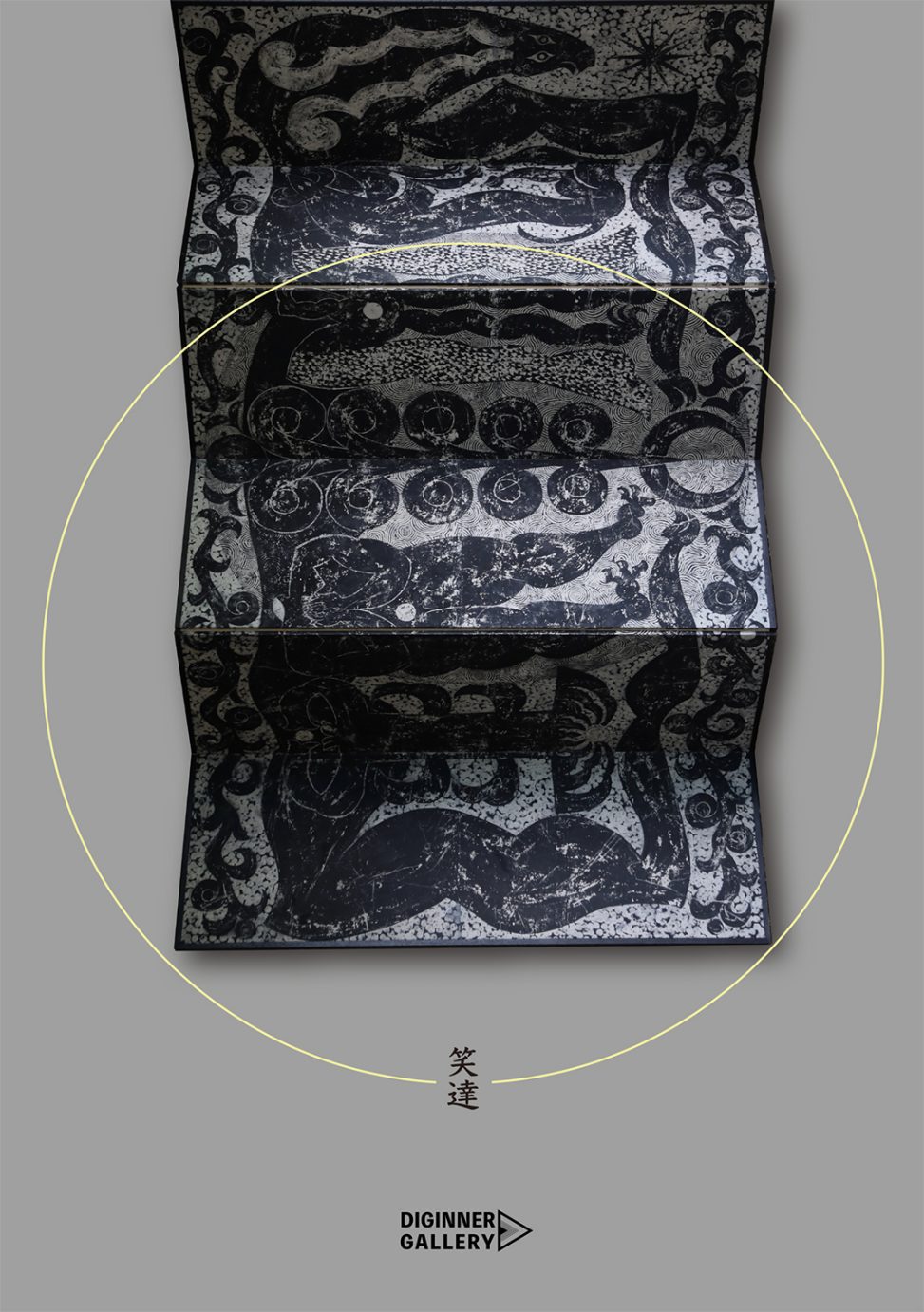 20年以上にわたり似顔絵描きとして活動してきた笑達は、京都での制作を経て、生まれ故郷である和歌山の山間部へと拠点を移した。この移住を機に、彼の作品は「人の肖像」から「土地の記憶」を描く表現へと根本的に変化を遂げている。転機となったのは、ある夜に見た夢であった。山のヌシたちが現れ、相撲を取り、仲間や大地と戯れるその光景は、目覚めた後も彼の心に深く刻まれた。以降、笑達の制作はその夢を起点に、自然と人間の境界を探る行為へと展開していく。彼が用いるのは、土や藍、べんがら、墨、煤といった、生活の延長線上にある素材である。和紙、古布、木片などを支持体とし、ときには描いた作品を土に埋め、水で洗い流すこともある。自然の力に委ねることで、時間や風、光、雨といった現象が画面に痕跡を刻み、やがて有機的な形が浮かび上がる。画面には、光の輪に向かって鳴く鳥、胸の奥で弾ける月、星明かりのもとで抱き合う人々、太陽に手を合わせる姿など、詩的で象徴的な風景が描かれる。それらは、自然のエネルギーと人間の感情が交錯する世界を映し出している。笑達の制作は、明確な形を追うものではない。日々の生活の中で聴こえる風の音、動物の声、光と闇の往来といった感覚を通じ、夢と現実、自然と自己との対話を続けている。その行為は、人間が本来有していた「生きることと創造することの一致」を呼び覚ます、原初的な表現の実践と言えるだろう。