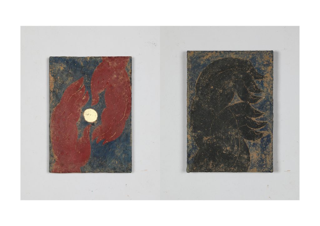 For more than two decades, Shotatsu has been known for his work as a portrait artist. After years of activity in Kyoto, he returned to his native mountains of Wakayama — a move that marked a profound shift in his artistic practice. What once centered on human likeness has gradually transformed into an exploration of place, memory, and the invisible energies that dwell within the land.The turning point came through a dream. One night, the mountain spirits appeared before him — engaging in sumo wrestling, laughing, and playing in nature. The vision lingered long after he awoke, becoming the foundation of his new way of creating: an attempt to converse with the unseen forces that shape both nature and humankind.Working with materials drawn directly from his surroundings — earth, indigo, bengara (iron oxide pigment), sumi ink, and soot — Shotatsu paints on washi paper, aged fabrics, and wooden boards. At times, he even buries his paintings in soil or washes them in water, allowing natural elements to leave their marks over time. Through this process, wind, light, rain, and the passing of days become active participants in the creation, and forms emerge organically from within.His paintings depict poetic and symbolic visions: birds calling toward rings of light, moons bursting within the chest, figures embracing under starlight, and people offering their hands in prayer to the sun. These scenes reveal a world where human emotion and the rhythm of nature intertwine.Shotatsu’s work does not aim for fixed form. It unfolds through his daily life — in the sound of wind, the cries of animals, the dialogue between light and shadow. Within this ongoing process, dream and reality, nature and self, quietly merge. His practice recalls an ancient and essential mode of creation — where to live and to create are one and the same.
