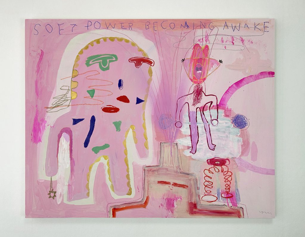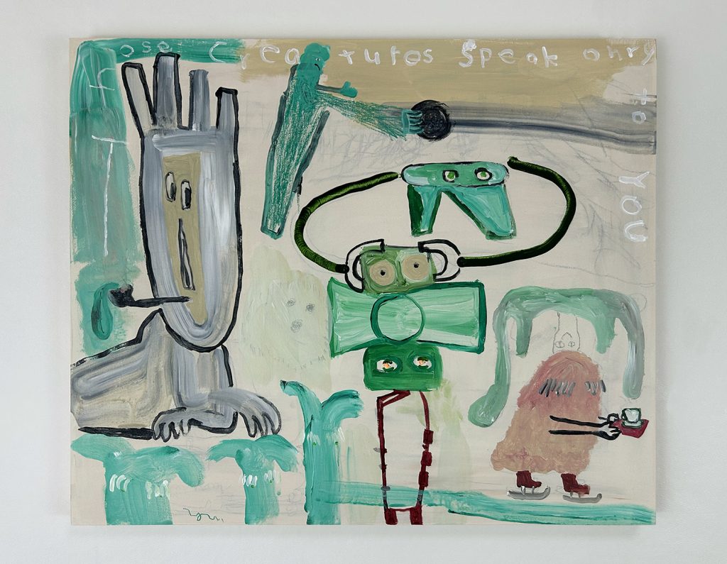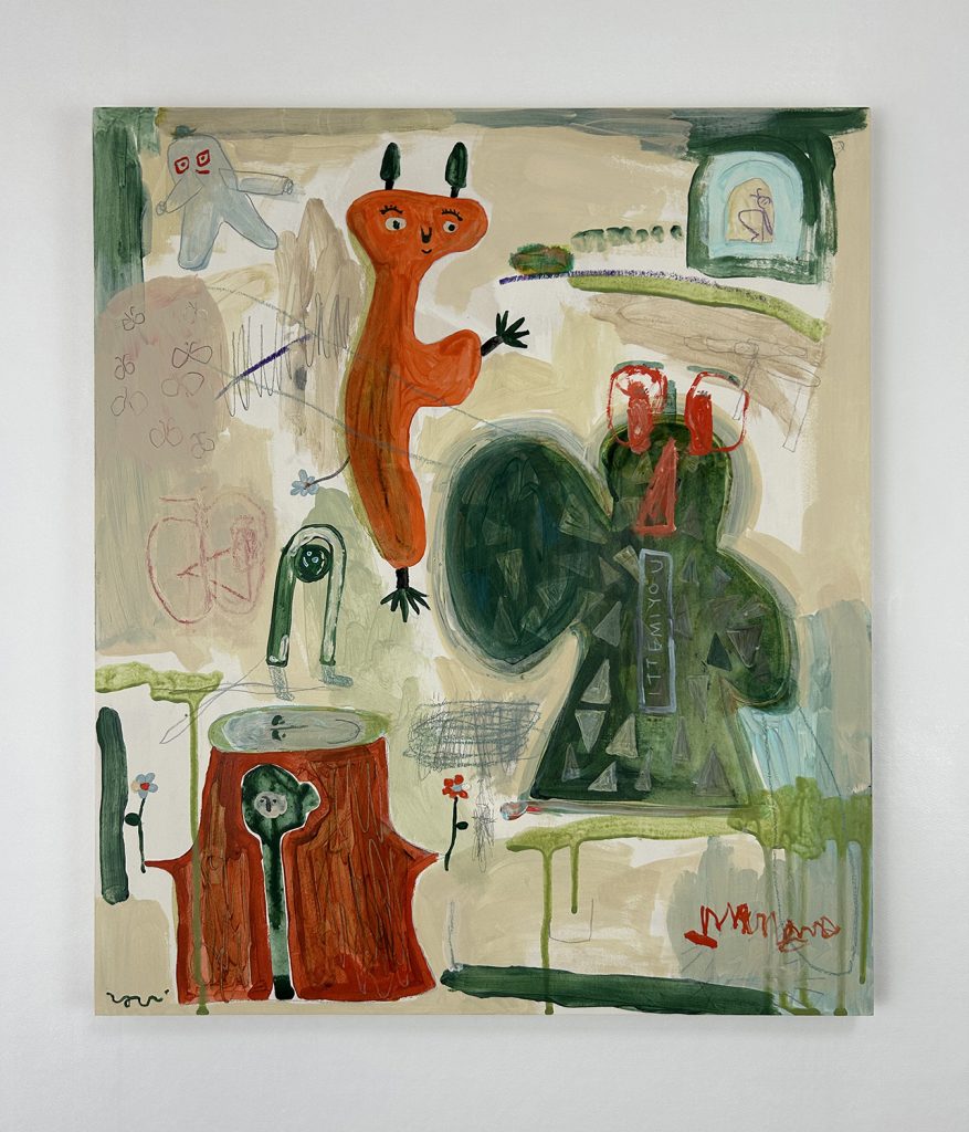 今回発表される作品群は、従来のイラストレーションやグラフィックの文脈とは異なり、より自由で、より即興的な絵画として立ち現れます。画面に登場するのは、どこか愛嬌を湛えながらも説明を拒む存在たち。にじみや走り書きの線、塗り重ねられた色彩の層が、彼らの住むもう一つの世界を浮かび上がらせます。